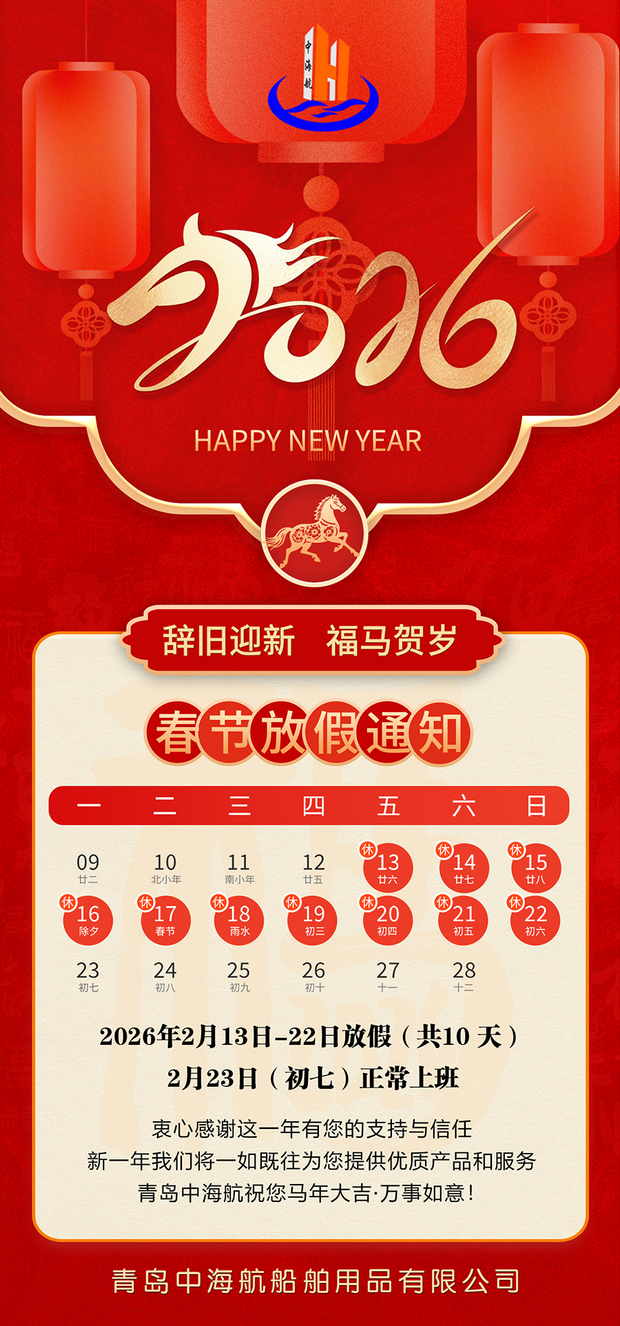 2026年青岛中海航春节放假通知 2/11/2026 10:40:26 AM 756次 2026年2月13日-22日放假(共10 天) 2月23日(初七)正常上班 上一篇: 2026年2月23日正月初七,中海航开工大吉! 下一篇: 青岛中海航2025年上海国际海事会展